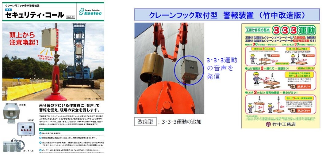 これまでは「吊荷が通ります。ご注意ください。」というアナウンスのみで吊荷周辺の作業員への注意喚起のみであったが、自由に作成した複数のアナウンスを登録できるようになったことにより、玉掛け3・3・3運動に対するアナウンスを用い、玉掛け者への注意喚起を行ったり、熱中症注意のアナウンスを行うことなどがことなどができるようになった。