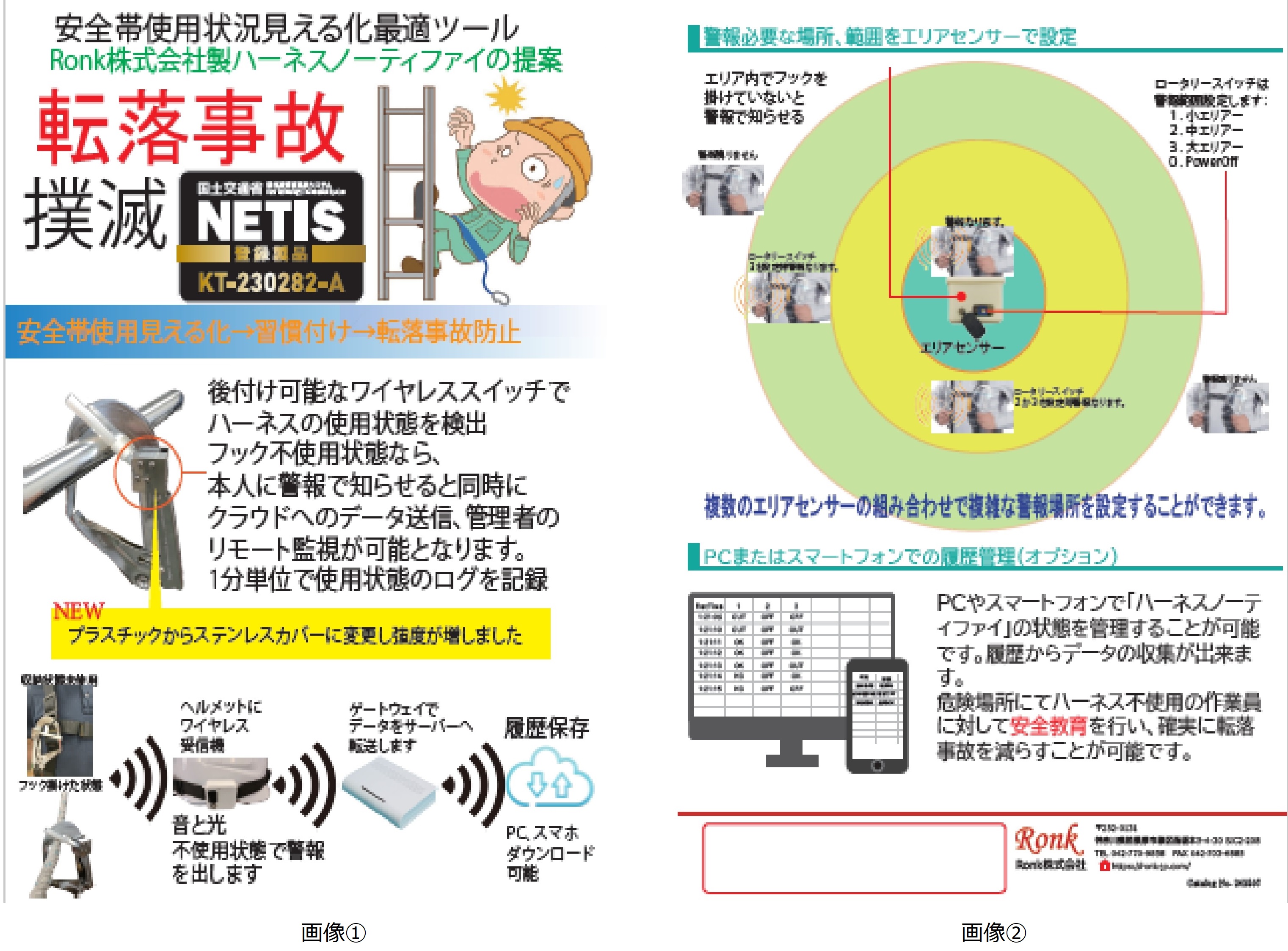 エリアセンサー内でフックを掛けていないと本人に警告音を鳴らす装置である。管理者はリアルタイムの使用状況や過去のログをスマホやPCにて確認することが出来る。